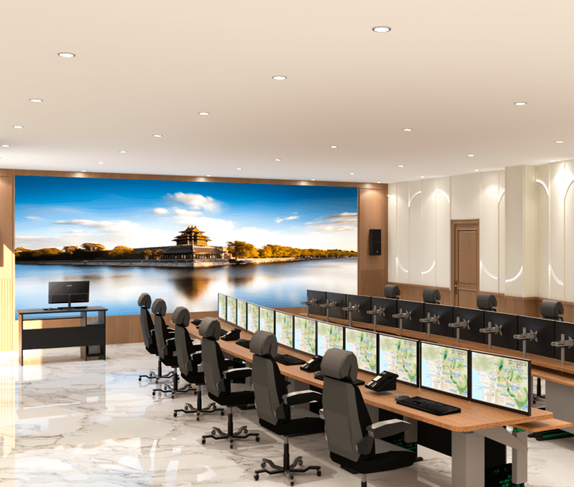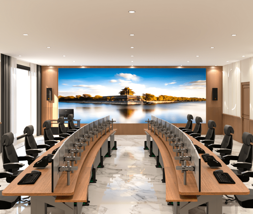 - Meja berbentuk melengkung ganda yang menghadap layar besar di depan ruangan, memungkinkan setiap operator memiliki pandangan jelas ke layar utama.