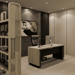 - Warna dasar netral coklat muda dan krem membuat ruangan terasa hangat dan profesional.
