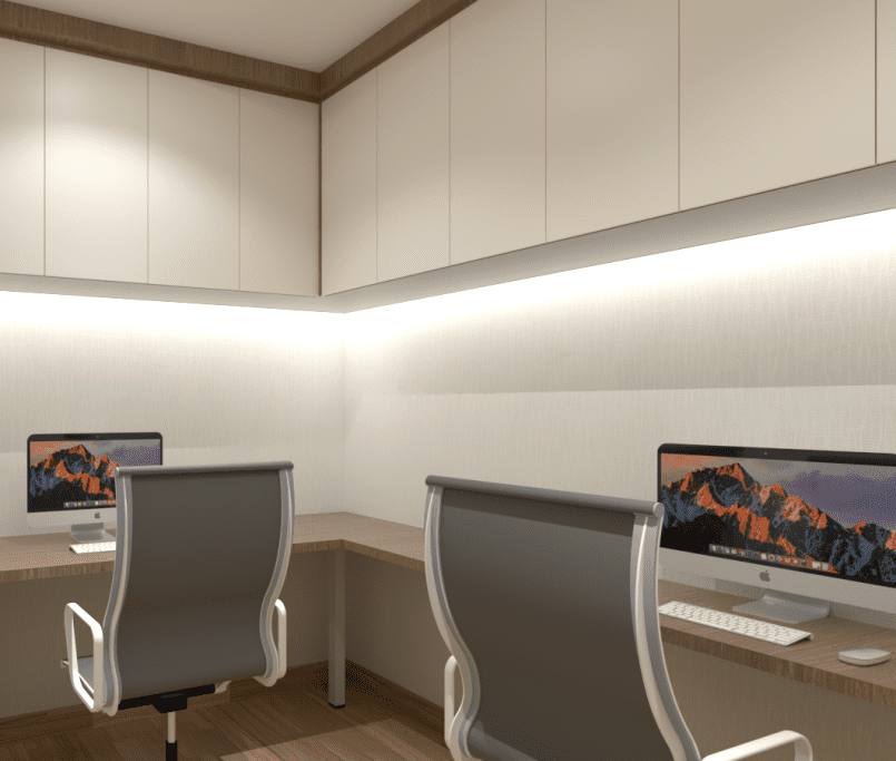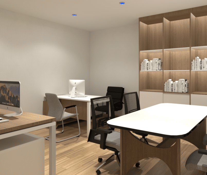 Custom Furniture: Seluruh meja kerja, rak penyimpanan, dan partisi dibuat custom dengan material berkualitas tinggi.